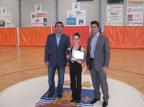 El alcalde, Andrés Martínez, junto con el edil del Deportes en el consistorio, Dani Biosca, hicieron entrega a Lía de una placa de reconociemiento a sus méritos en el Pabellón Polideportivo Municipal.