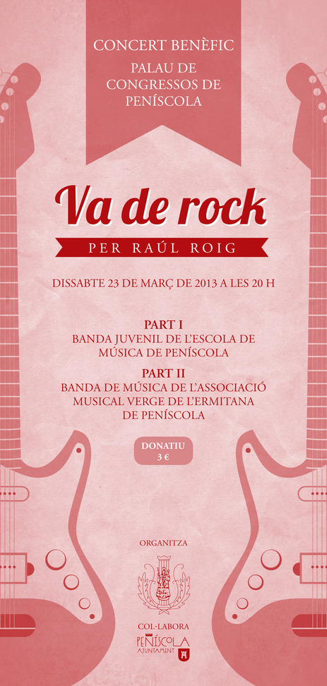 El próximo sábado 23 de marzo la Banda de l'Associació Musical Virgen de l'Ermitana y la Banda Juvenil de l'Escola de Música Ciudad de Peñíscola realizarán conjuntamente "Va de Rock", un concierto de temática Pop-Rock en el Palacio de Congresos de la ciudad. La cita, que tendrá lugar a las 20:00 horas y un precio de entrada-donativo de 3€, vuelve un año más con una finalidad humanitaria: conseguirle un andador a Raúl Roig, un niño de 7 años con parálisis cerebral.